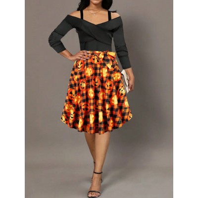 Shoulder Pumpkin Plaid Halloween Party Dress