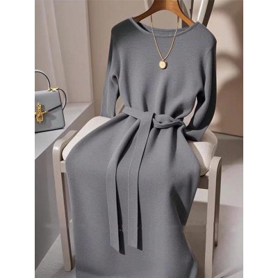 Grey Knitted Waist Belt Dress Fall Cloth For Women