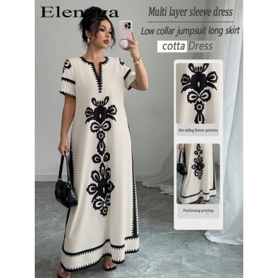 Elenzga Women's Floral Print V-Neck Short Sleeve Casual Long Dress