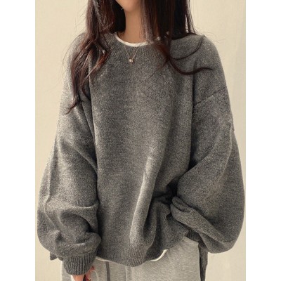 EAVA Fall/Winter Korean Style Minimalist Sweater Round Neck, Elegant Loose Fit Versatile Bell Sleeves Side Slit Pullover Knitwear For Women