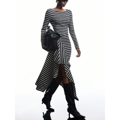 Women's Casual Striped Asymmetric Hem Long Sleeve Dress, Autumn,Fall