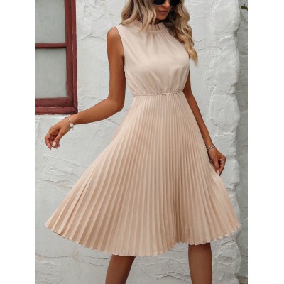 Women Elegant Solid Color Sleeveless Pleated Dress
