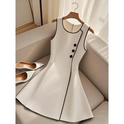 Women's Sleeveless Color Block Trim Elegant Cinched Waist Single-Breasted Summer Midi Dress