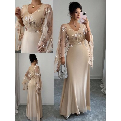 Women's Elegant Party V-Neck Sequin Mesh Splice Lantern Sleeve Waist Cinched Dress, Spring/Summer/Autumn