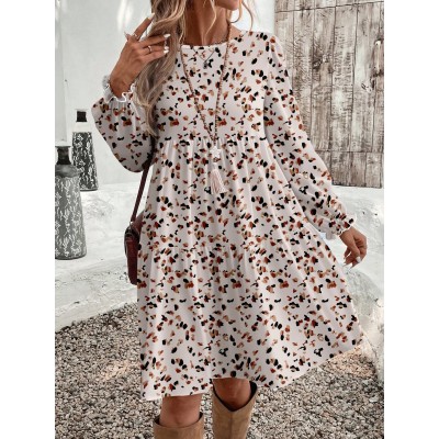 EMERY ROSE Allover Print Flare Sleeve Ruffle Hem Smock Dress Fall Cloth For Women