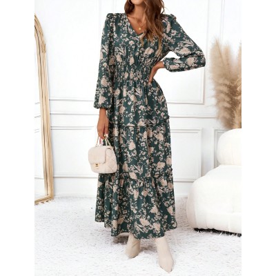 Casual Retro Floral Pattern V-Neck Ruched Long Sleeve Dress For Women, Suitable For Autumn Long Floral Dress Women Boho Dress Women Cottagecore Dress Fall Clothes For Women Chic Dress