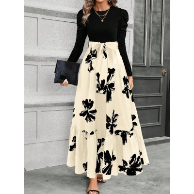 Women's Elegant Floral Print Puff Sleeve Tie Waist Dress, Spring/Autumn Roupa Para A Universidade Fall Cloth For Women