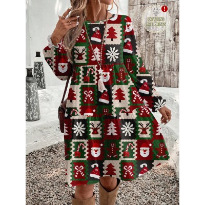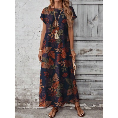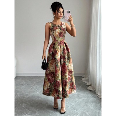 Casual Romantic Elegant Floral & Leaf Print Pattern Women's Midi Dress, Suitable For Dates And Outings, Autumn/Winter