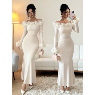 SHEIN Elenzya Women's Knit Off Shoulder Long Sleeve Dress With Side Ruching And 3D Floral Decor, Elegant For Daily, Commute, Fashion, French Street Style, Vintage, Versatile, Party, Holiday, Business, Apricot, Autumn/Winter