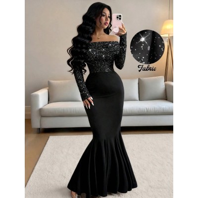 Firerie Elegant Sexy Black Lace Patchwork Asymmetric Neck Waist Slimming Fish Tail Maxi Dress, Suitable For Party & Dark Style, Autumn/Winter,Summer Dresses,Tea Party Dress