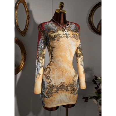 Amplova Y2K Amplova Elegant Christmas New Year Thanksgiving Digital Printing Romance Tight Hip Dress Vintage Wild Bodycon Mini Dress Women Autumn Winter