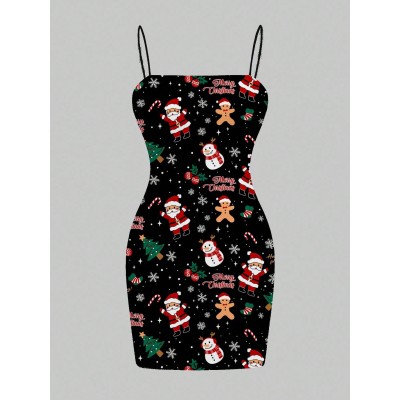 SHEIN EZwear Christmas Snowflake & Santa Claus Graphic Casual Minimalist Women Holiday Party Camisole Dress
