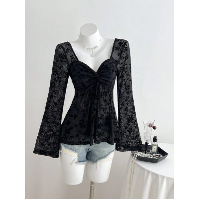 Elamini Women's Casual Twist Front V-Neck Long Sleeve T-Shirt, Versatile New Style, Spring/Autumn