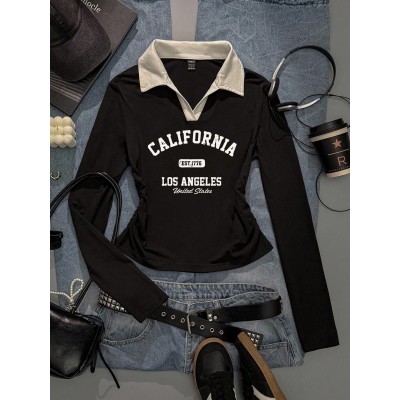 Attitoon Women's Casual Colorblock Pleated T-Shirt, California Print, Collegiate Style, Polo Collar, Tight Fit Undershirt, Autumn