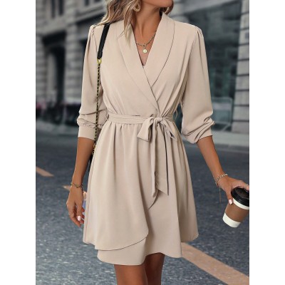 Shawl Collar Lantern Sleeve Belted Dress Fall Cloth For Women